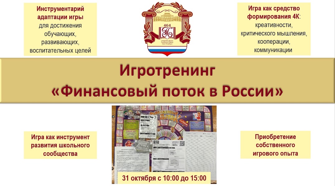 Мероприятие проводится в формате мастеркласса+игротренинга, где будет представлен авторский инструментарий адаптации игры «Финансовый поток в России» в качестве средства формирования финансовой культуры, универсальных компетенций (4К) личности обучающихся, а также школьного сообщества игропрактиков.